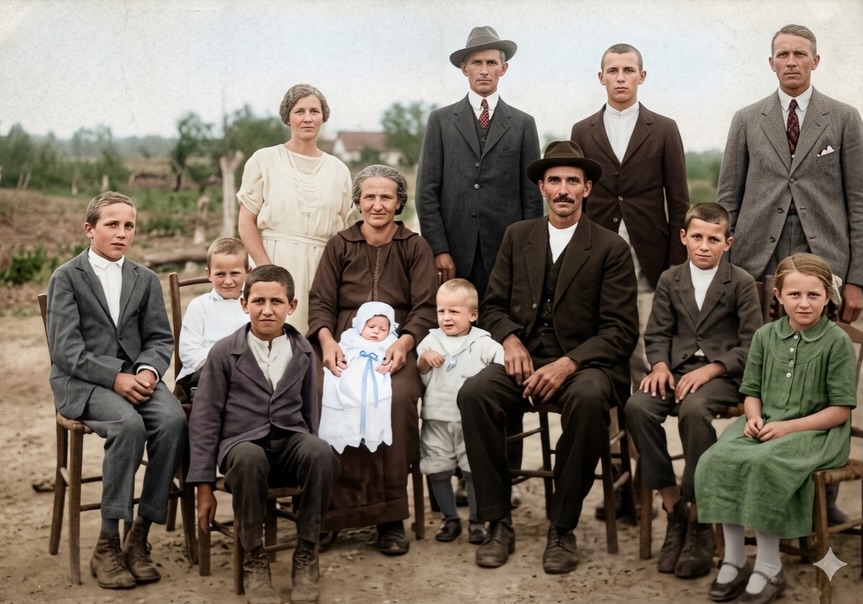 Família Cavalari em 1923. Restaurada e colorida por IA.